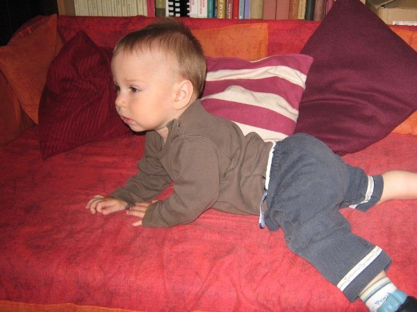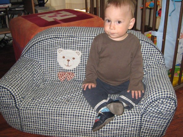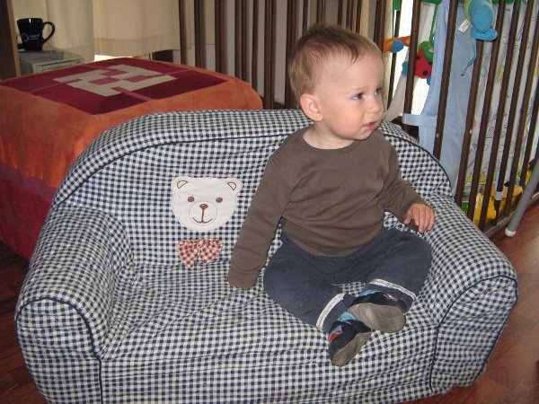 Miután Döme megtanult felmászni a (gyerek)kanapénkra, ami szükségből most a felnőtt kanapé funkcióját tölti be, gyereknap alkalmából kapott egy saját, még kisebb, bébikanapét, amit boldogan birtokba is vett: