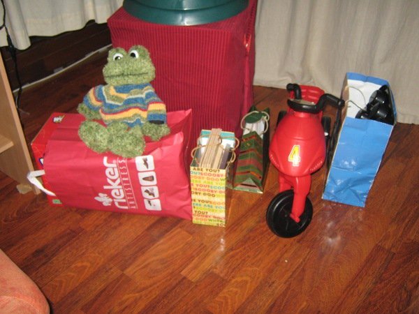 Este, miután leraktuk a gyerekeket, a fa alá készítettük az ajándékokat, majd a puffal, pihenőszékkel valamennyire eltakartuk, hogy ha Döme vándorol, ne arra ébredjünk, hogy elmélyülten játszik az éjszaka közepén nagyobbikunk a nappaliban:)