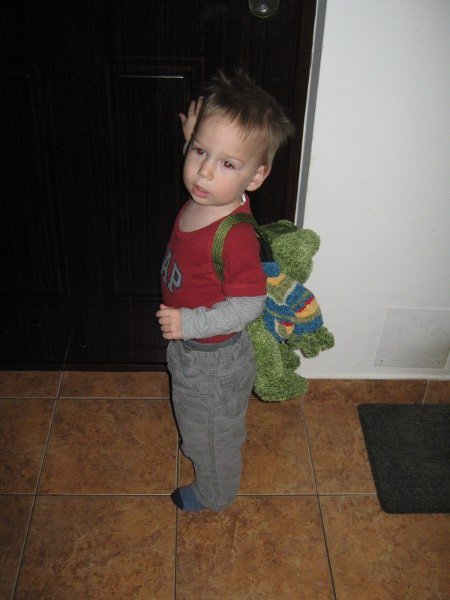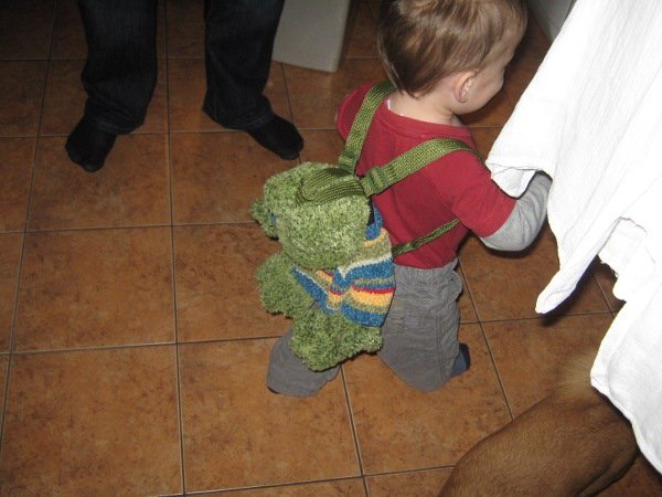 Először, óvatos duhajként a Békával (hátizsák) próbálkozott, osonó üzemmódban, a lábánál fogva 🙂